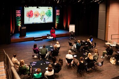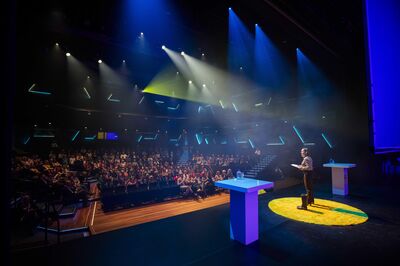 Met de reguliere theateropstelling maak je in podium twee gebruik van alle stoelen in de zaal. Bij een theateropstelling bevinden de sprekers zich op het podium.